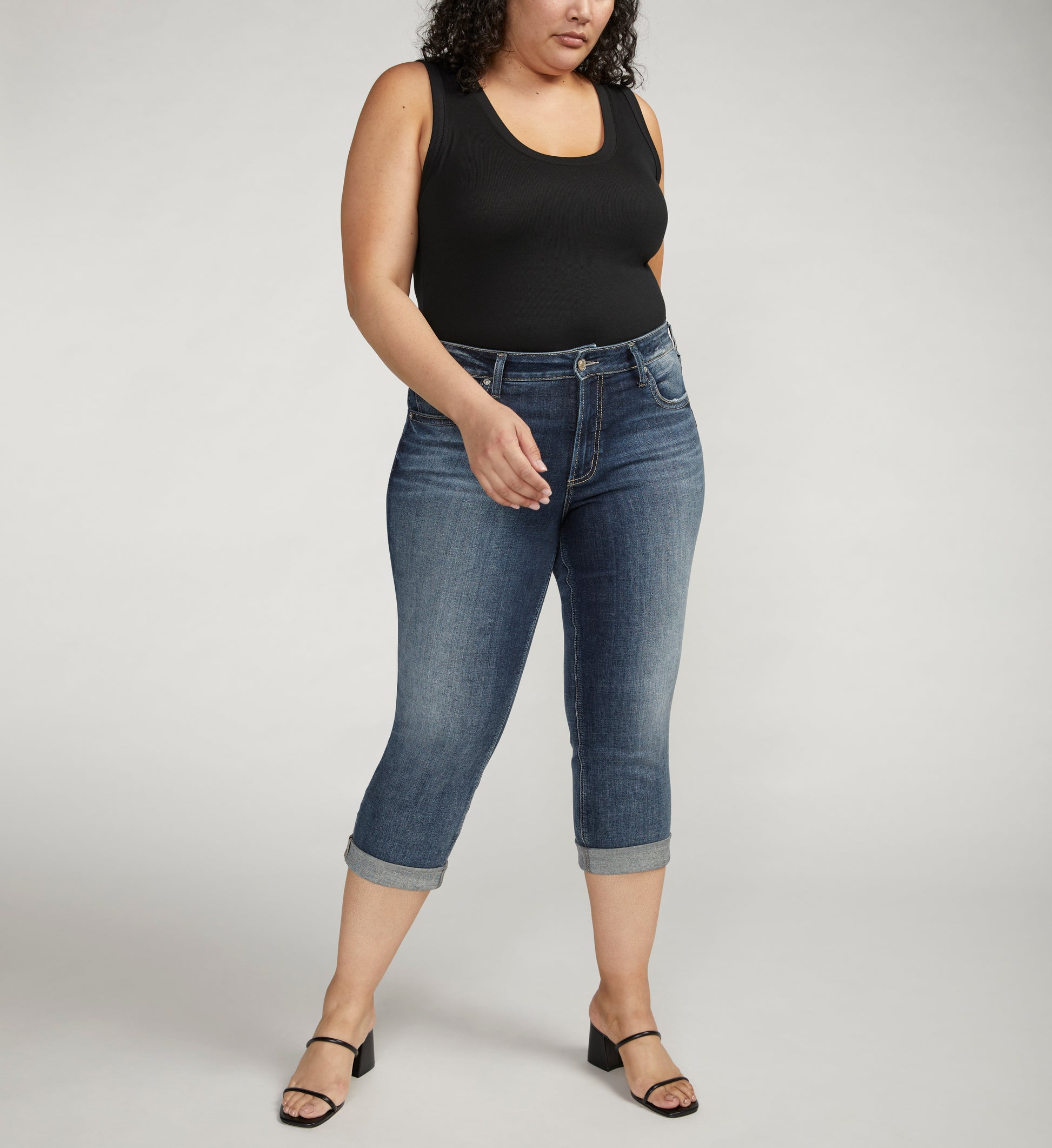 The Avery curvy fit is designed to flatter curvy body types with a smaller waist and fuller hips. The everyday high rise provides some extra coverage while the contoured waistband prevents gapping. Finished with ease in the hip and thigh for curve-hugging perfection. Capris with a dark indigo wash 12. 5 high rise This is a super dark indigo denim with a perfectly balanced authentic crosshatch look. It features sustainable properties and T400® for performance stretch capabilities. 5-pocket styling with a zip fly and button closure 16 leg opening 23. 5'' inseam Silver Jeans Women's Avery Rise Capri Plus Size Pant in Dark Indigo 12 x 23. 5, Cotton/Elastane/Polyester