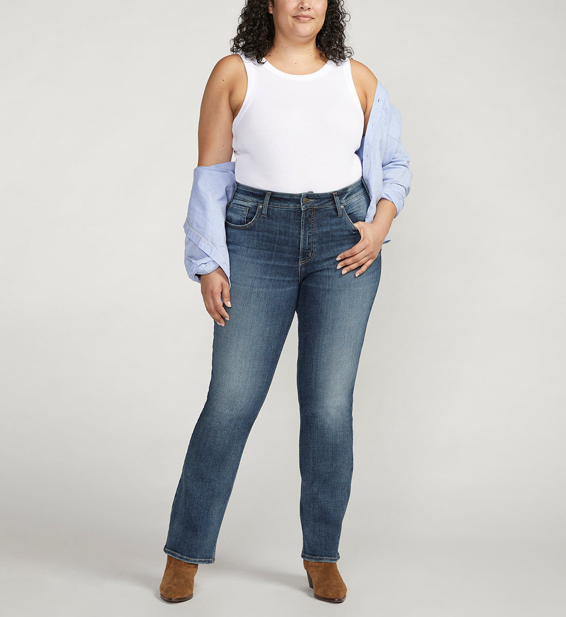 The Avery curvy fit is designed to flatter curvy body types with a smaller waist and fuller hips. The everyday high rise provides some extra coverage while the contoured waistband prevents gapping. Finished with ease in the hip and thigh for curve-hugging perfection. Curvy fit jeans with a dark indigo wash 12. 5 high rise Power stretch denim with our highest elasticity and recovery 5-pocket styling with a zip fly and button closure 18. 5 leg opening 31/33/35 inseams Modeled in a size 14 Model measurements: Height 5'10, Bust 39, Waist 34, Hip 47 Silver Jeans Women's Avery Rise Slim Bootcut Jeans Plus Size in Dark Indigo 14 x 31, Cotton/Elastane/Polyester