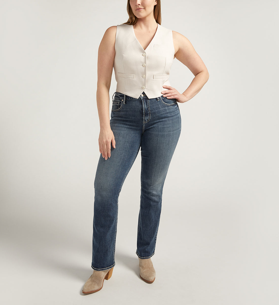 These women's plus size curvy fit jeans have a high rise and slim bootcut leg. Inseam lengths are 31" or 33".