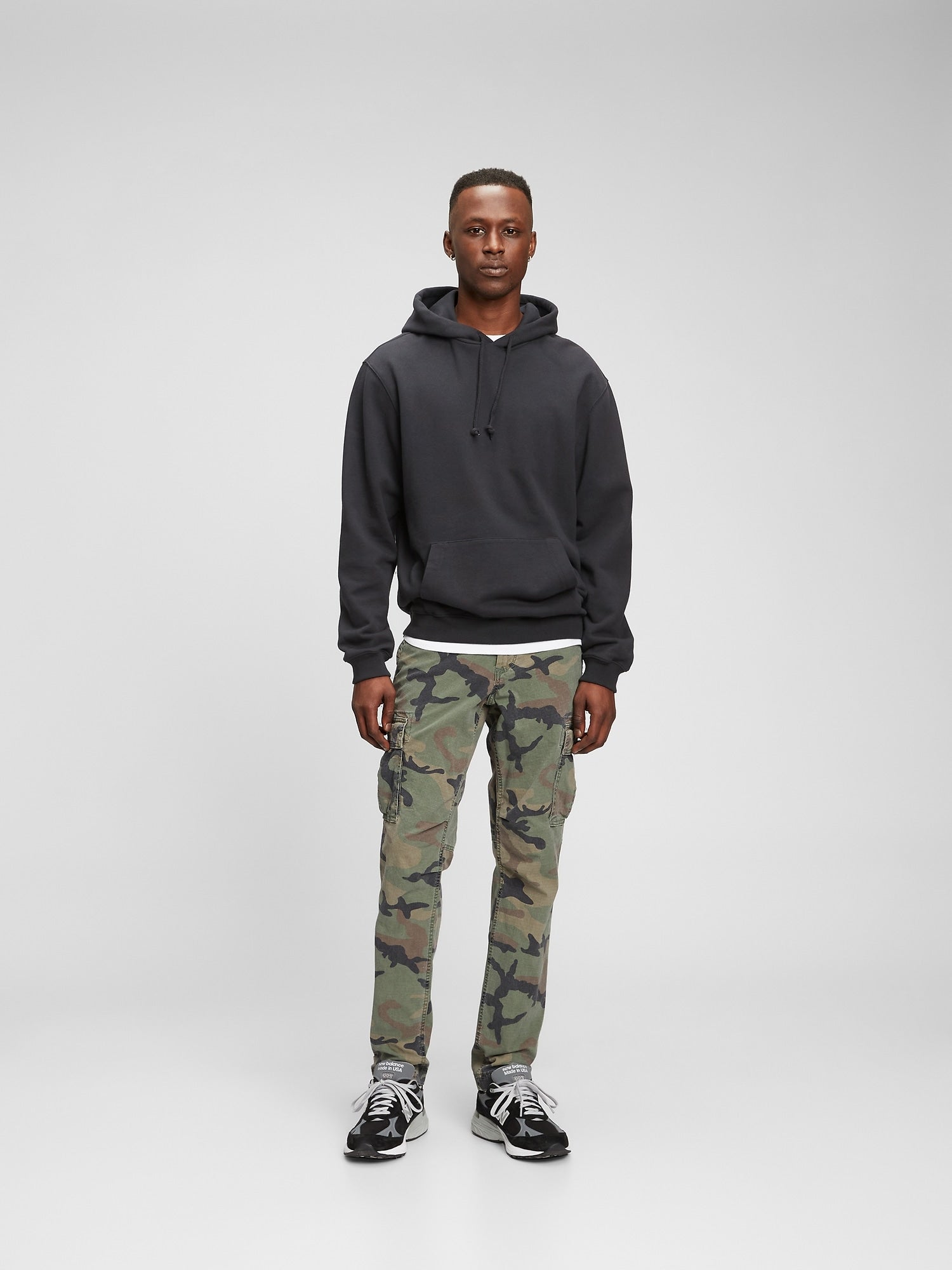 Smooth twill weave GapFlex stretch technology. Special stretch waistband for added comfort. Button closure, zip fly. Front slant pockets, rear flap pockets. Cargo pockets with hidden button-closure at sides. Certain styles have allover camo print. Sits low on the waist. Fuller through the thigh. Slim leg opening. Model is 6'1" (185 cm), waist 31" (79 cm), wearing a regular Gap size 32x32. Lycra 2.0 Cotton 98.0