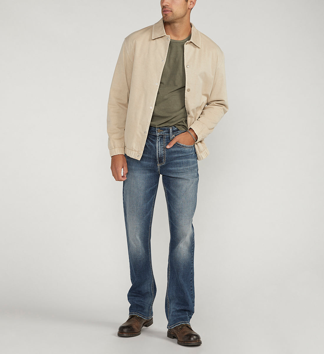 Easy as can be, Craig is a laid-back, classic fit for guys who value comfort most. This jean sits at the waist and features a longer saddle for extra room. It's engineered with a streamlined fit through the hip and thigh and finished with a tried-and-true 19.5" bootcut leg opening. Bootcut jeans with a medium-dark indigo wash Sits at the waist with a classic hip and thigh Max flex denim with the highest amount of stretch for superior flexibility 5-pocket styling with a zip fly and button closure 19.5'' leg opening 30/32/34/36'' inseams Modeled in a size 32 and 32"" inseam Model Measurements: Height 6'1", Waist 32" Silver Jeans Men's Craig Classic Fit Bootcut Jeans Sits At The Waist in Dark Indigo 30x30, Cotton/Elastane/Polyester