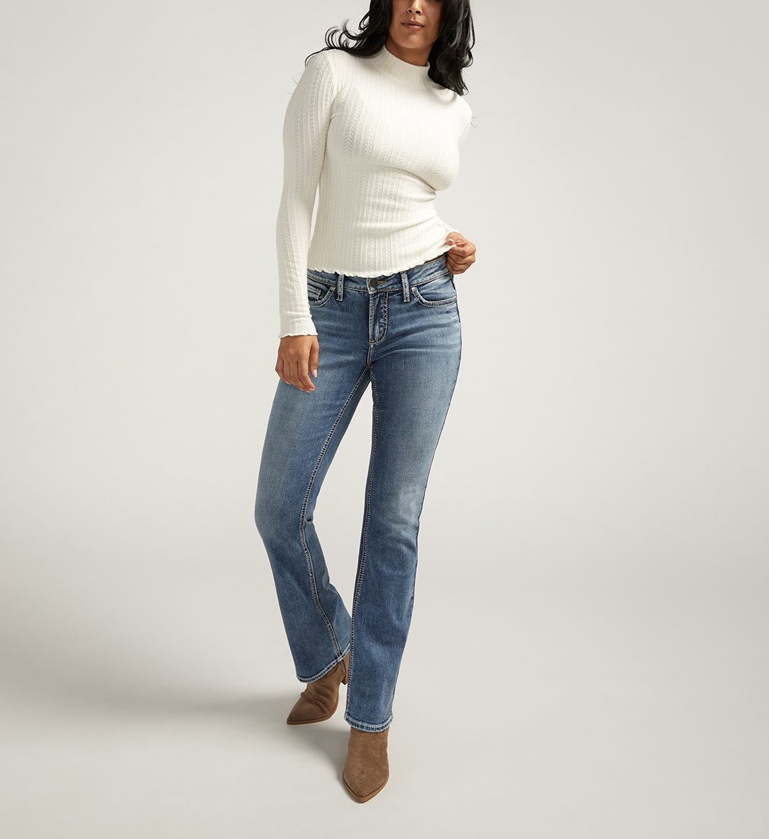 These medium wash mid rise jeans have a slim bootcut leg and come in 3 inseam lengths: 31", 33" and 35".