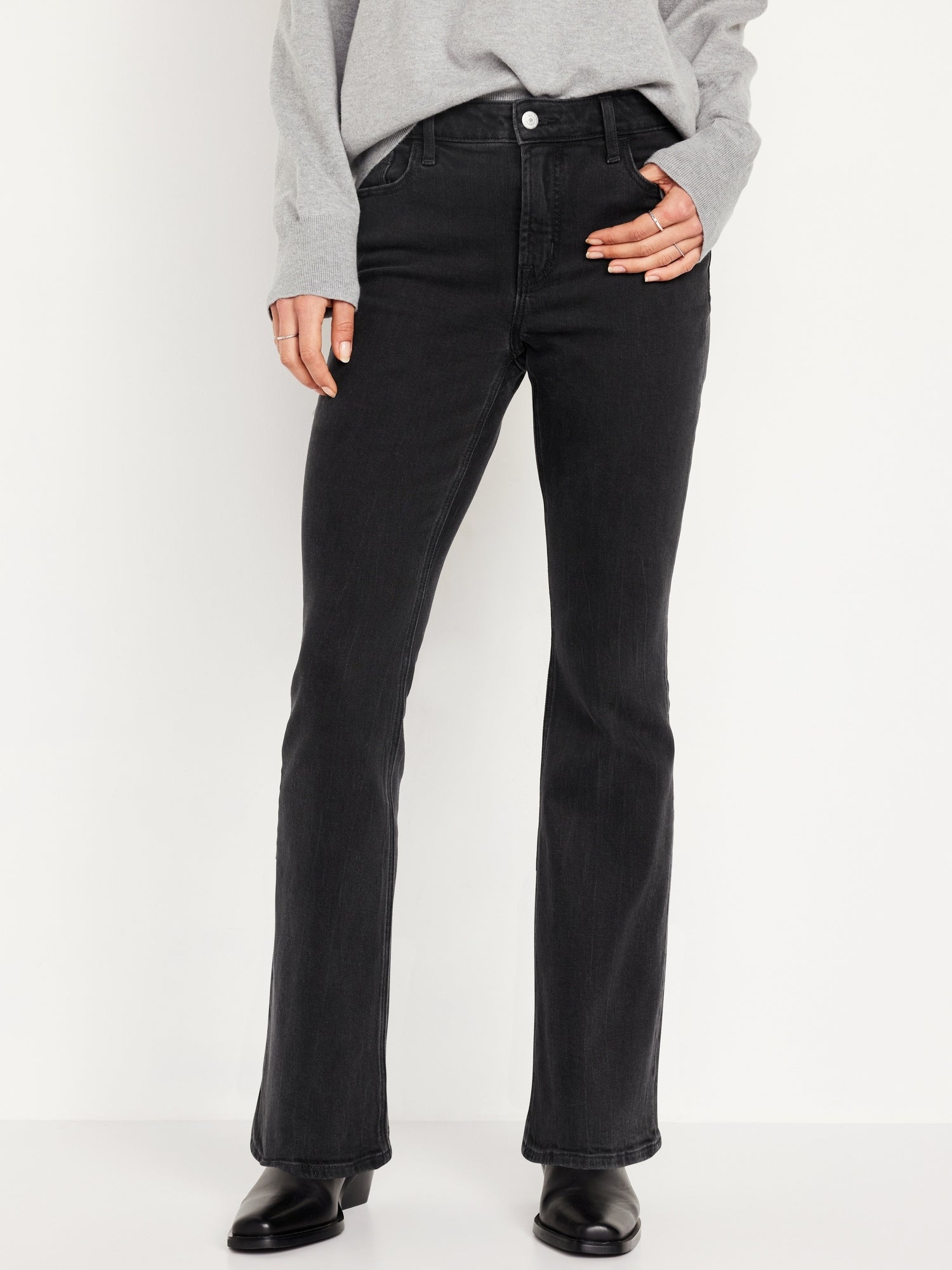 These women's jeans have an extra high rise and flared leg. Inseam lengths are 29", 31" and 34".