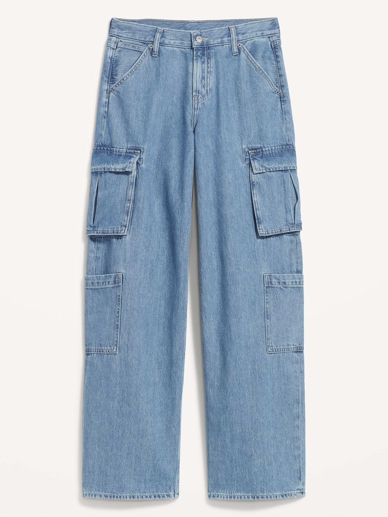 These women's baggy wide leg cargo jeans have a mid rise and come in 3 inseam lengths: 30" regular, 28" petite, and 33" tall.