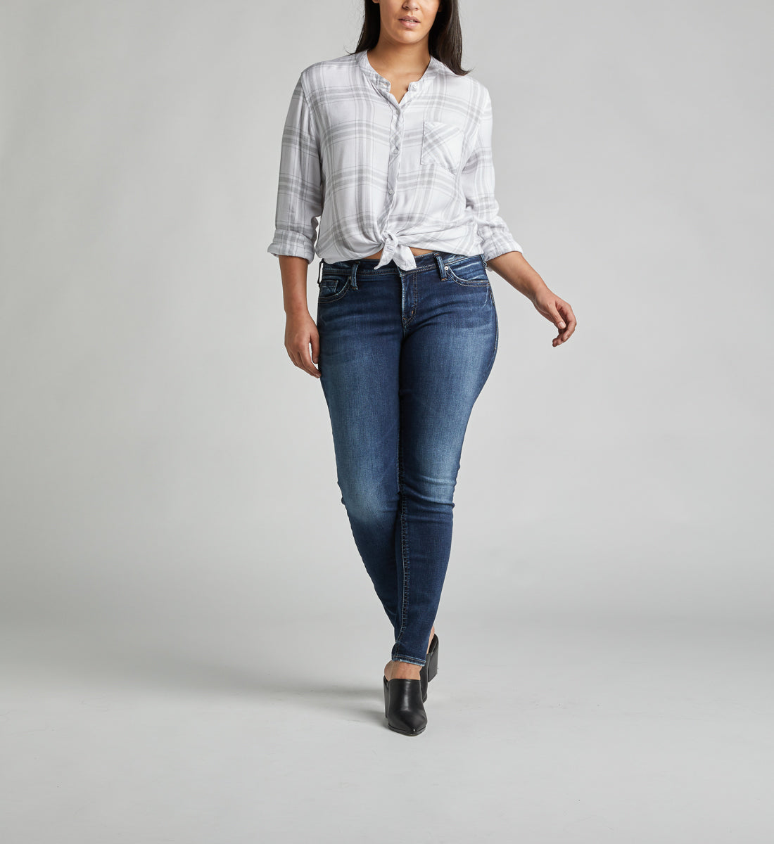"The ultimate curve-flattering jean Suki features a comfortable mid rise and relaxed fit through the hip and thigh. Made with our innovative Denimotion fabric it's guaranteed to fit like the first time every time. This pair is washed to a dark indigo shade with natural hand sanding and whisker patterns. Finished with a super skinny leg and our signature stitching on the back pockets. Mid-rise super skinny jeans with a dark indigo washCurvy fit with a relaxed hip and thighSuper-stretch denim with ultimate recovery and shaping qualities5-pocket styling with a zip fly10 rise 12. 5 leg opening 27/29/31/33 inseams Silver Jeans Women's Suki Super Skinny Dark Wash Pant Mid Rise in Indigo 12 31"" inseam, Cotton/Polyester/Lycra Elastane"