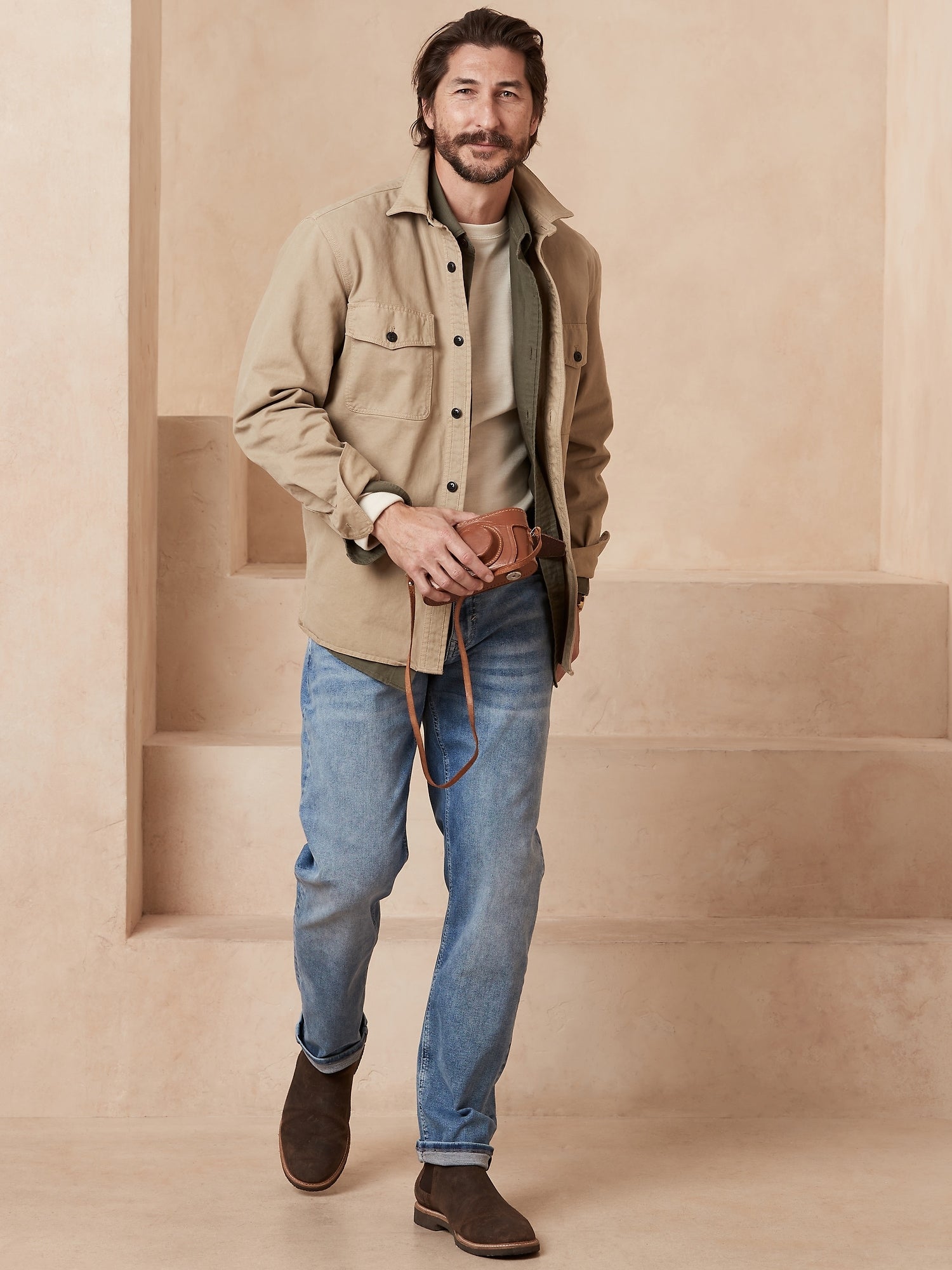 Now arriving: the World Traveler Jean. Made with our WATERSHED Mill Valley Denim, this specially engineered jean has unbelievable stretch for first-class comfort wherever your travels take you. NEW STRAIGHT FIT: We updated our Straight fit by taking in the leg from knee to hem for a slightly slimmer fit. SUSTAINABILITY: Made with a blend of organic cotton, recycled cotton, and recycled polyester sourced from 4. 3 plastic bottles. WASHWELL™: Better denim. Better planet. This pair of jeans is part of our Washwell™ program, which uses at least 20% less water than conventional wash methods. Zip fly with button closure. Five-pocket styling. NEW Straight Fit: Mid-rise. Slim through the thigh. Straight leg opening measures 7.5" flat. Model: Size 32x32, 6'2" (188cm). Machine wash.