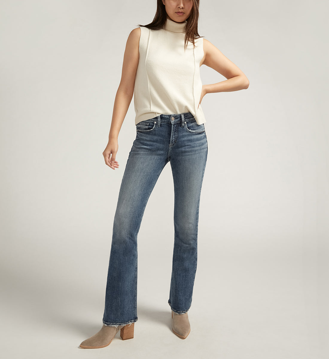 These medium wash curvy jeans have a mid rise and bootcut leg. Available in 3 inseam lengths: 31", 33" and 35".
