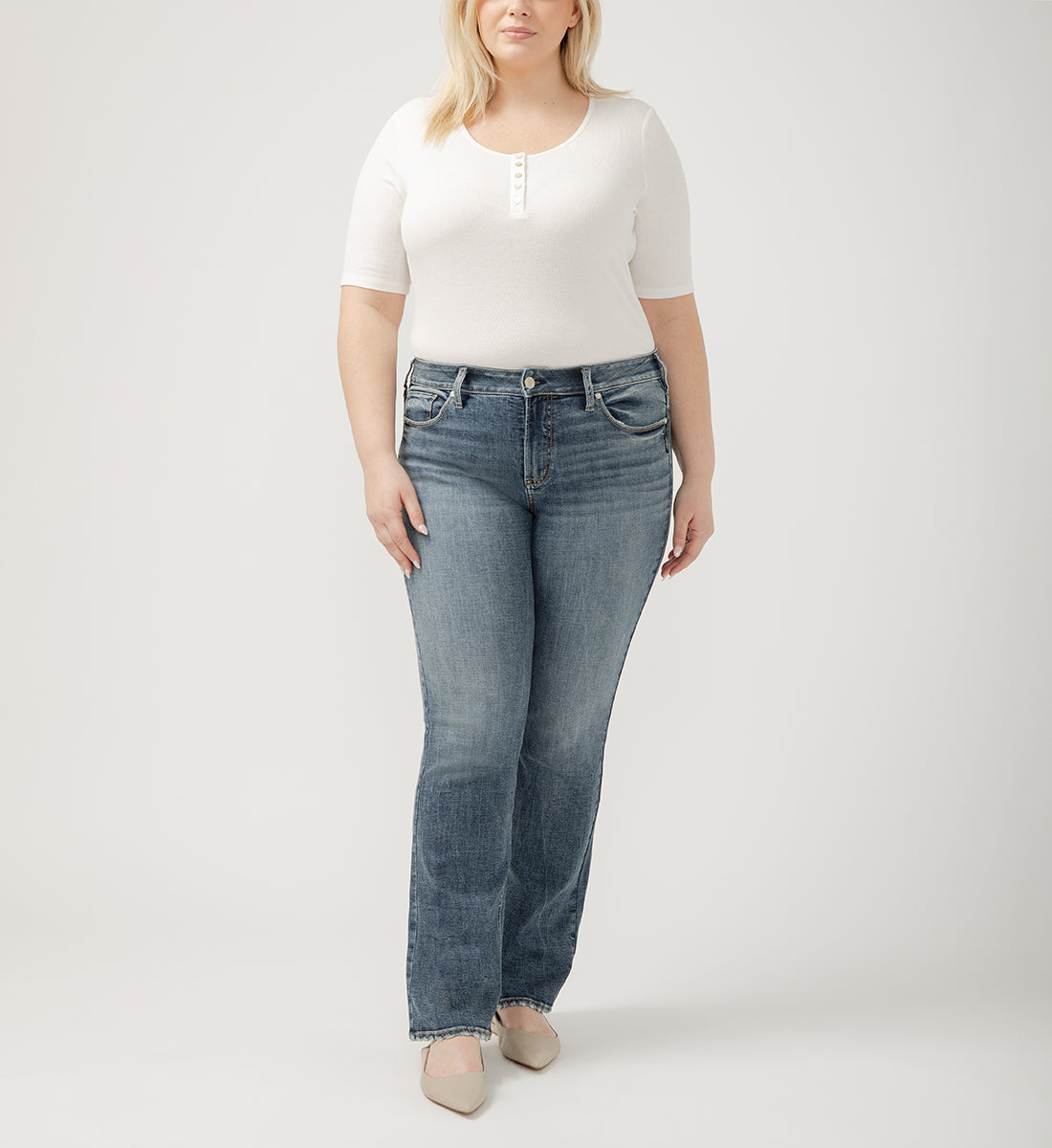 These women's plus size curvy fit jeans have a bootcut leg and come in both a 31" and 33" inseam length.