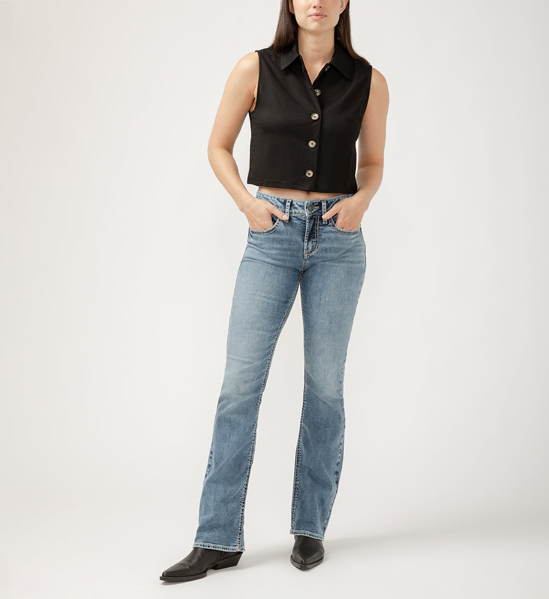 These women's slim bootcut jeans have a mid rise and come in 31", 33" and 35" inseam lengths.