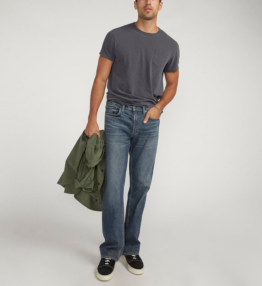 If you're searching for comfort, think Zac: the casual, relaxed-fit jeans made for the guy who wants to both look and feel his best. This style sits just below the waist, with a laid-back fit through the thigh that's great for everyday wear. Finished with a leg opening that's wide enough for boots. Straight leg jeans with a medium-dark indigo wash Sits just below the waist with a relaxed hip and thigh Mid flex denim with a comfortable feel and moderate stretch for mobility 5-pocket styling with a zip fly and button closure 19 leg opening 30/32/34/36 inseams Modeled in a size 32 and 32" inseam Model Measurements: Height 6'1", Waist 32" Silver Jeans Men's Zac Relaxed Fit Straight Leg Jeans Sits Just Below The Waist in Dark Indigo 28 x 30, Cotton/Elastane/Polyester